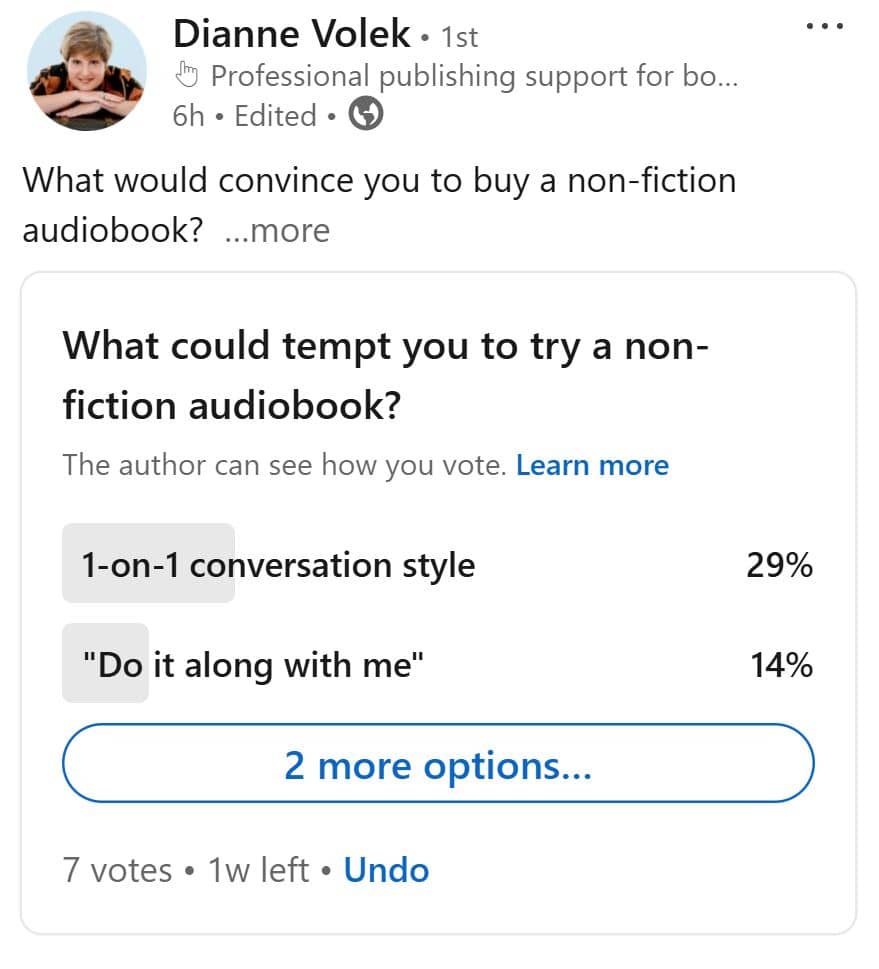 Dianne wants to know what would convince you to buy a nonfiction audiobook. Take a minute to answer her poll. My answer: narrated by the author. I find it hard to listen to audiobooks, but if I know the author narrated it, I'm more likely to listen. It gives it a more personal feel. What about you?